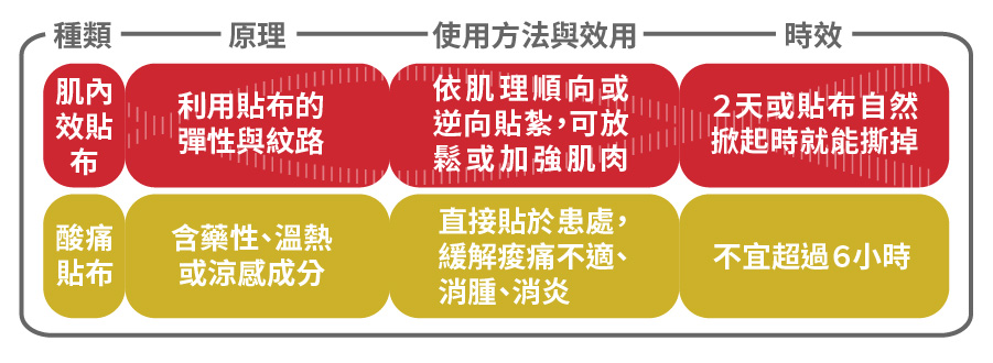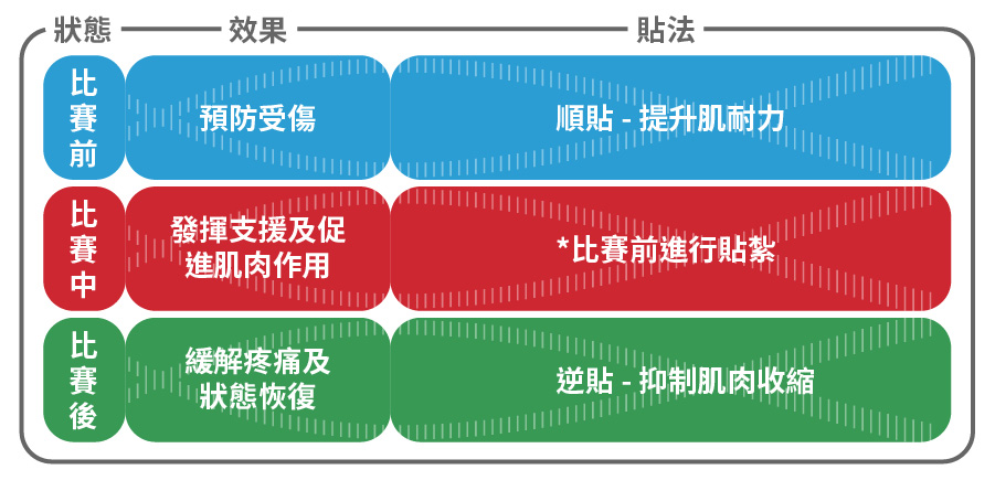 貼護方法可以簡單的區分成兩大類,順貼:提升肌耐力、逆貼:抑制肌肉收縮,分別應用在比賽的前後,針對特定肌肉給予強化或放鬆治療,達到預防運動過程中所產生的運動傷害,並有效緩解疼痛和加速肌肉狀態恢復。