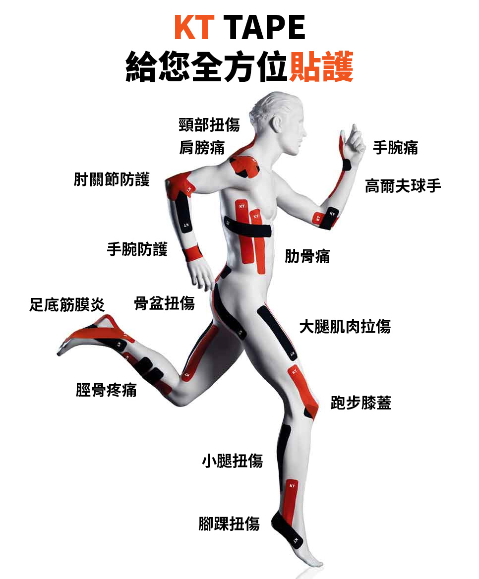 KT TAPE肌內效貼 是一種具有彈性的運動貼布,與大家熟知的酸痛貼布不同,沒有藥物成分,僅透過貼布的彈性材質、紋路設計和力學方向,拉扯皮膚及筋膜改善血液及淋巴循環,且透氣排汗的材質,適合於運動中使用。