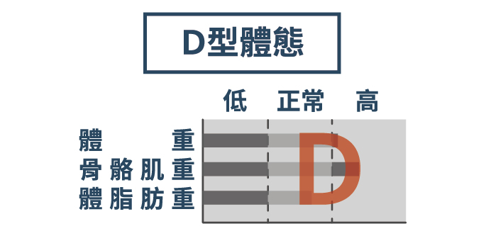 恭喜你!你擁有扎實的肌肉量體態,平常走在路上,一定有許多稱羨的眼神在欣賞你的好身材!但大部分的D型體態的人,會繼續想提升自己的肌肉量、讓自己有更好的狀態!在增肌訓練的過程中,要注意補充營養品的攝取量,及訓練過程中的安全。