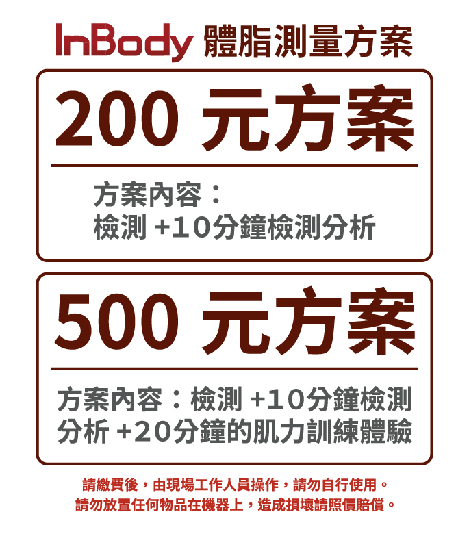 服務方案:200元方案:Inbody檢測 + 10分鐘的檢測分析(由教練為您做分析講解和運動建議)
